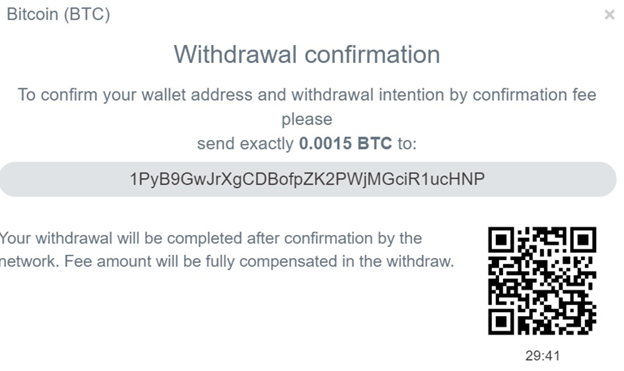 At that point, it is safe to say that this website is pretty alarming and there has to be something behind it. When clicking on the “Withdraw” button the website represents the following message, asking for a 0.0015BTC fee due to withdrawal: