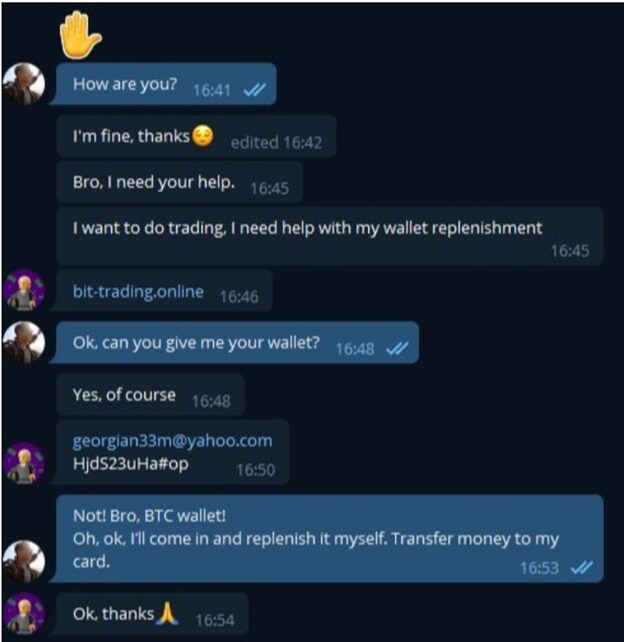 1. The attackers “leaked” georgian33m account in various ways, here is an additional photo of an allegedly innocent Telegram conversation, it is obvious at this point that this is another part of the scam: